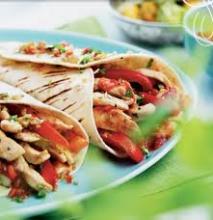 Mexicaanse kip met roerbakgroenten. Met de rest van de kruiden breng je de kip op smaak. De traditionele tortilla wordt gemaakt van mais.